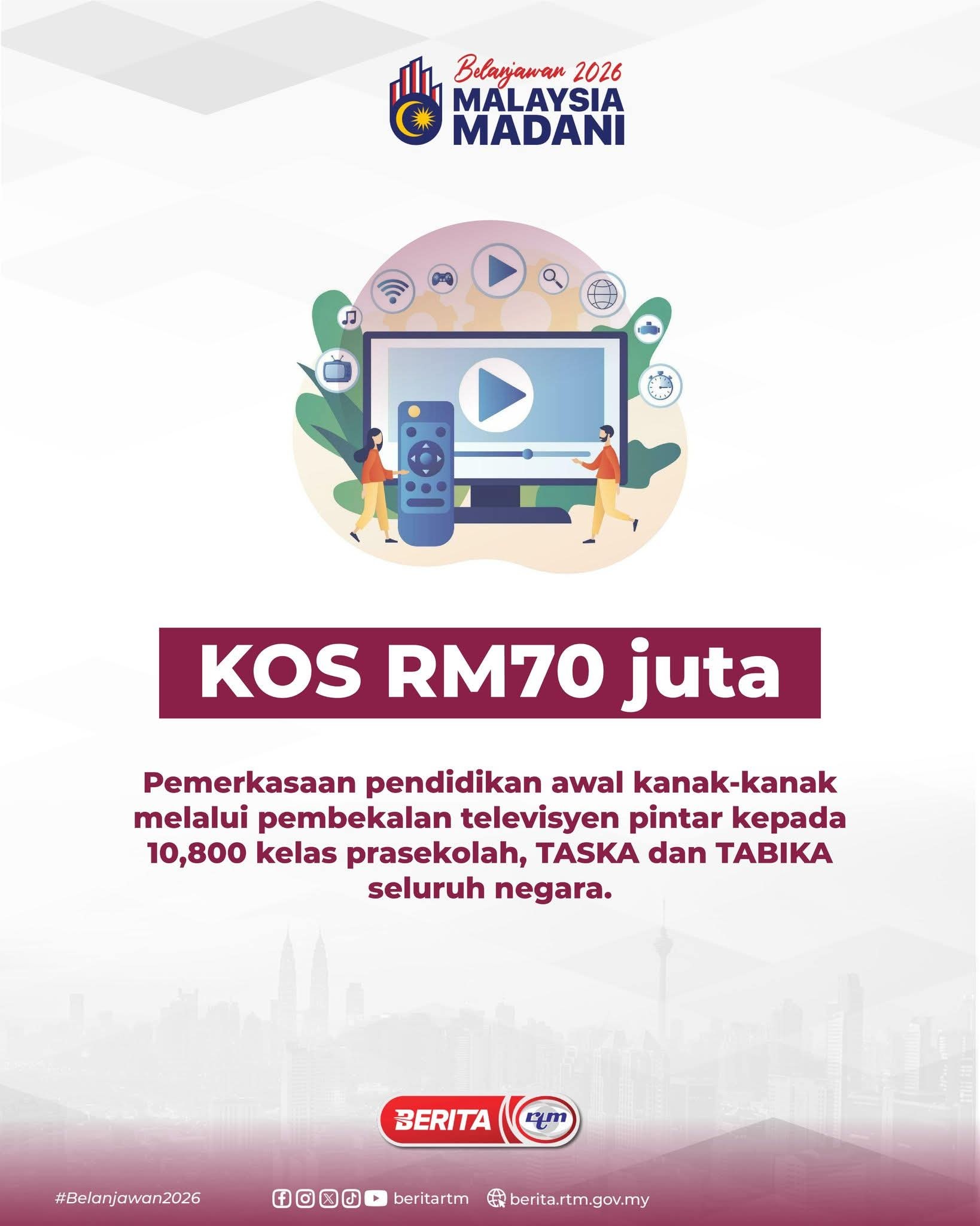 - RM70 juta – pemerkasaan pendidikan awal kanak-kanak melalui pembekalan televisyen pintar kepada 10,800 kelas prasekolah, TASKA dan TABIKA