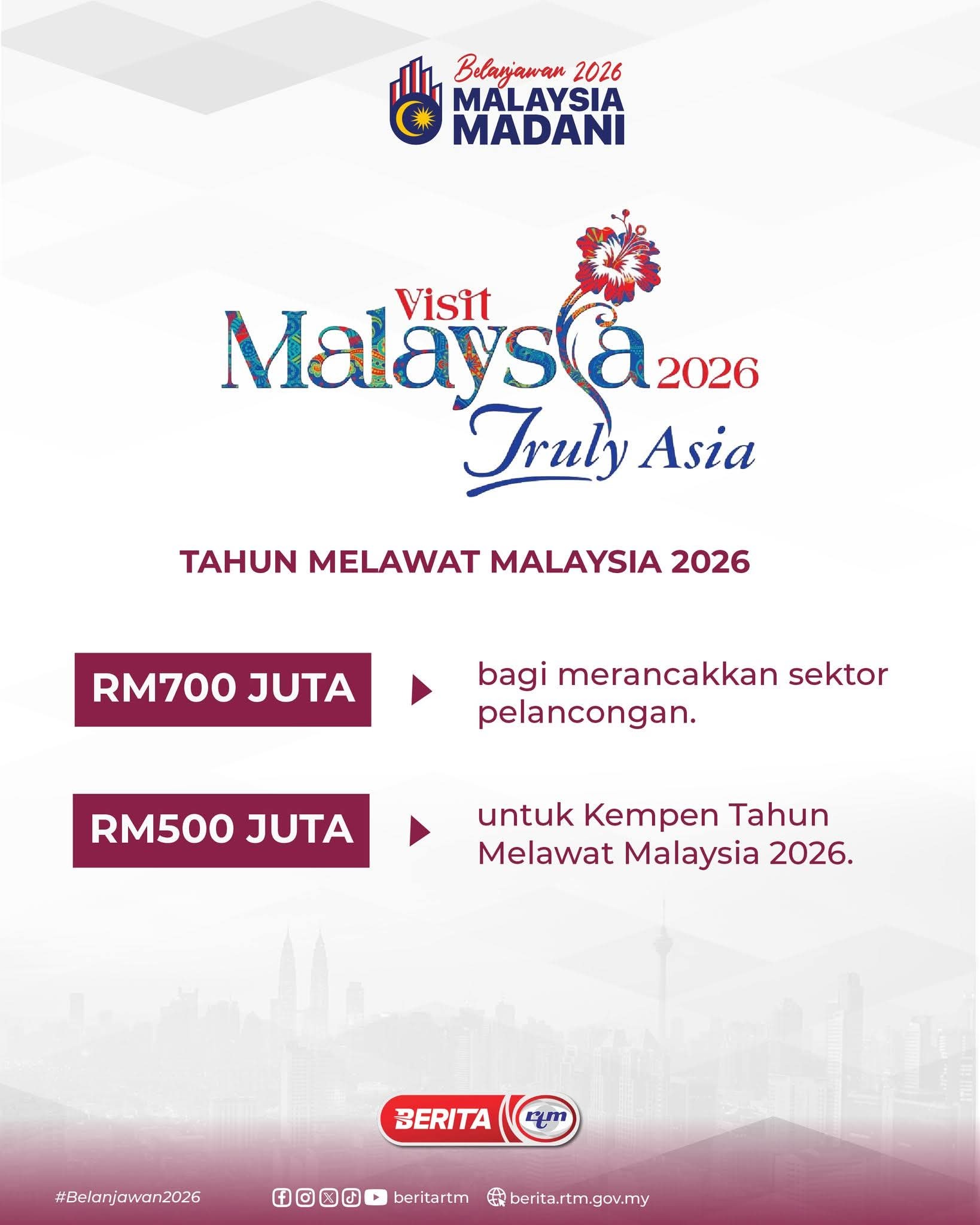 - RM500 juta – bagi pelaksanaan Kempen Tahun Melawat Malaysia 2026 (TMM2026)