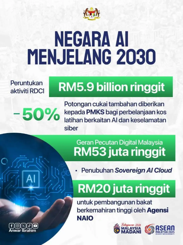 - Sovereign AI Cloud akan dibangunkan oleh SKMM dengan pelaburan RM2 bilion.