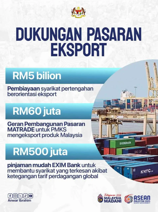 - EXIM Bank menawarkan pinjaman mudah RM500 juta bagi syarikat yang terkesan oleh ketegangan tarif perdagangan global