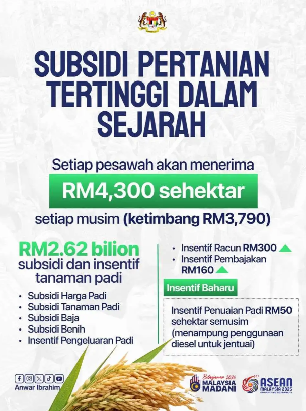 - RM2.62 bilion disediakan untuk subsidi dan bantuan pesawah.