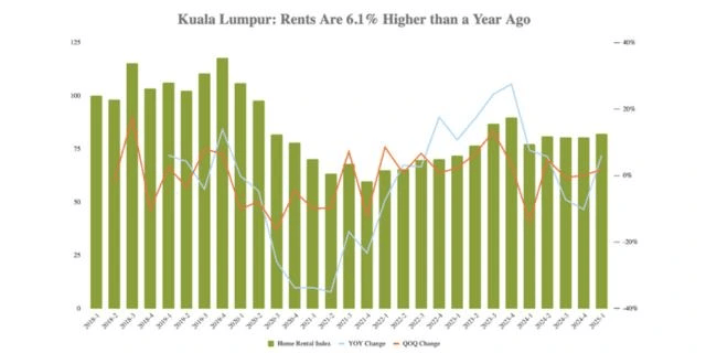 Pada Q1 2025, Kuala Lumpur mencatat peningkatan sewa sebanyak 1.9% secara sukuan dan 6.1% secara tahunan, melebihi purata nasional yang berada pada 5.2%. Kadar kenaikan sewa yang lebih tinggi di Kuala Lumpur berbanding purata nasional (+6.1% berbanding +5.2%) menunjukkan bahawa KL bukan sahaja mendahului trend nasional, malah terus mengukuhkan kedudukannya sebagai nadi ekonomi Malaysia.