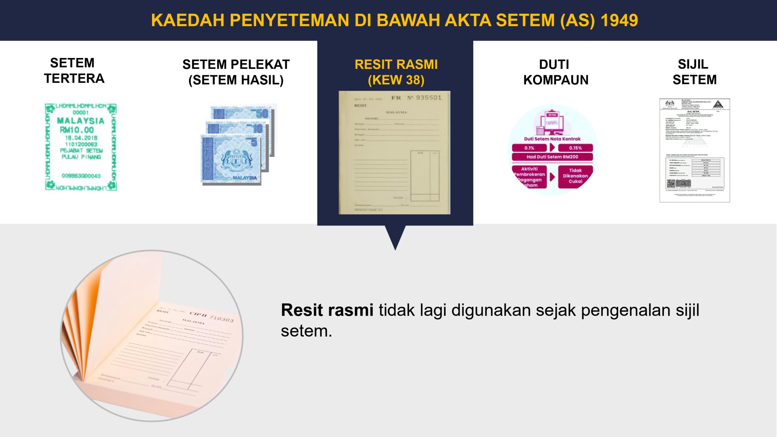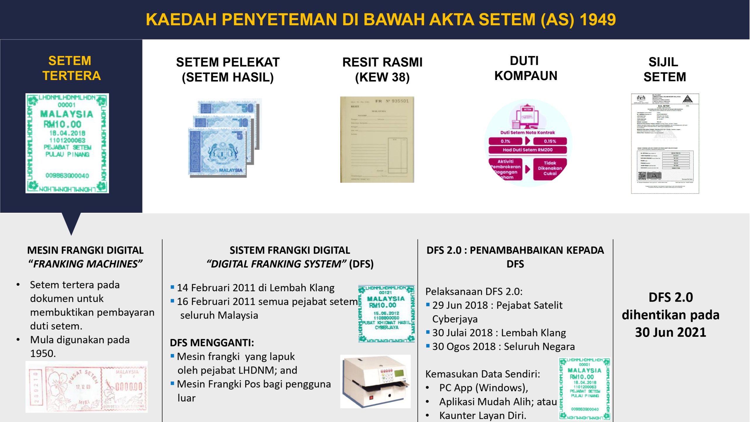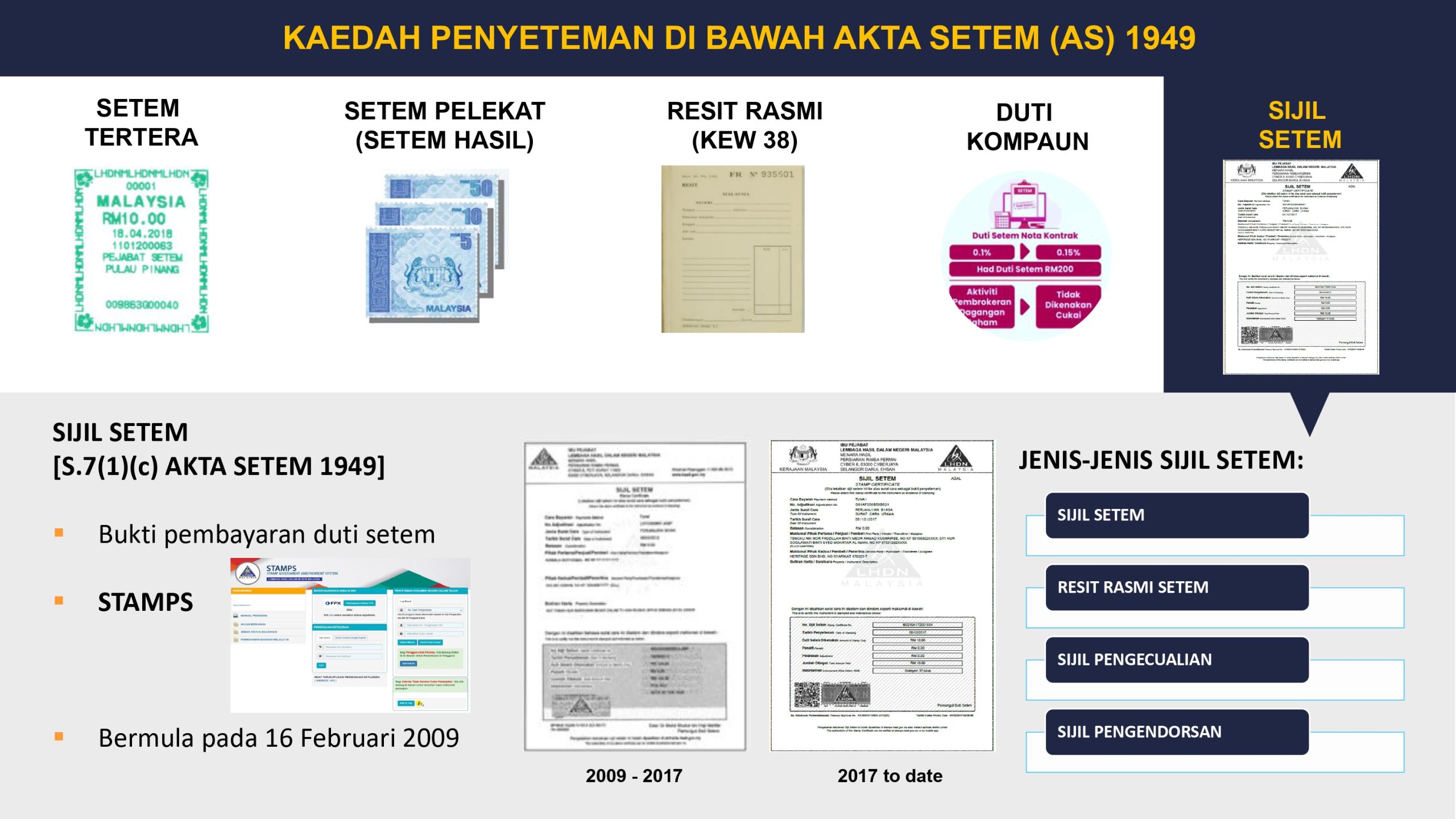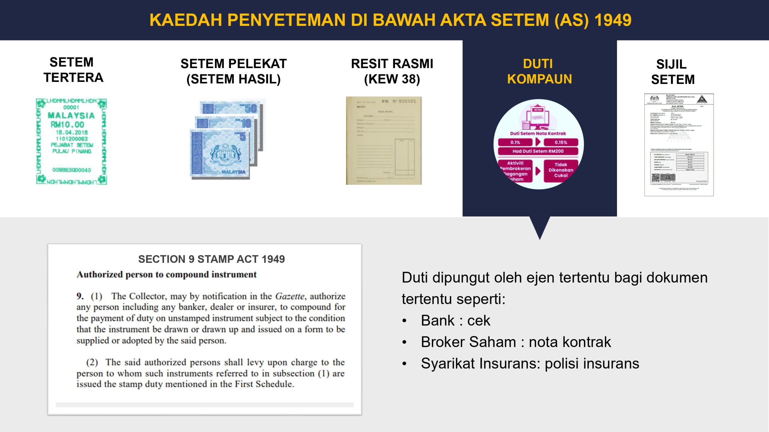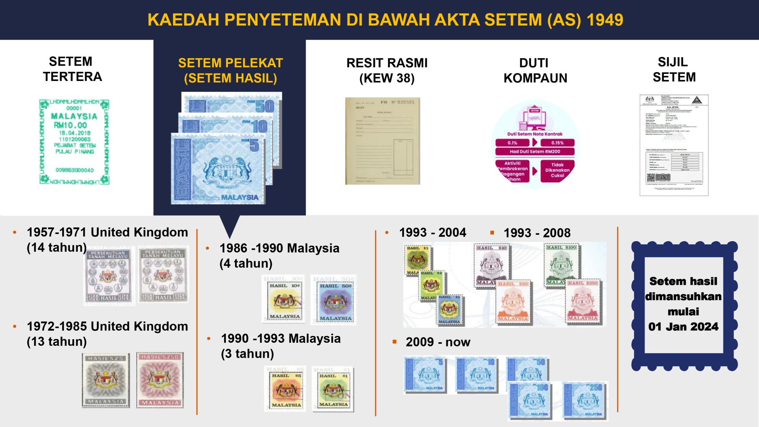 - Penilaian dan Pungutan Duti Setem diperuntukkan oleh undang-undang bertulis yang kini dikenali sebagai Akta Setem 1949.