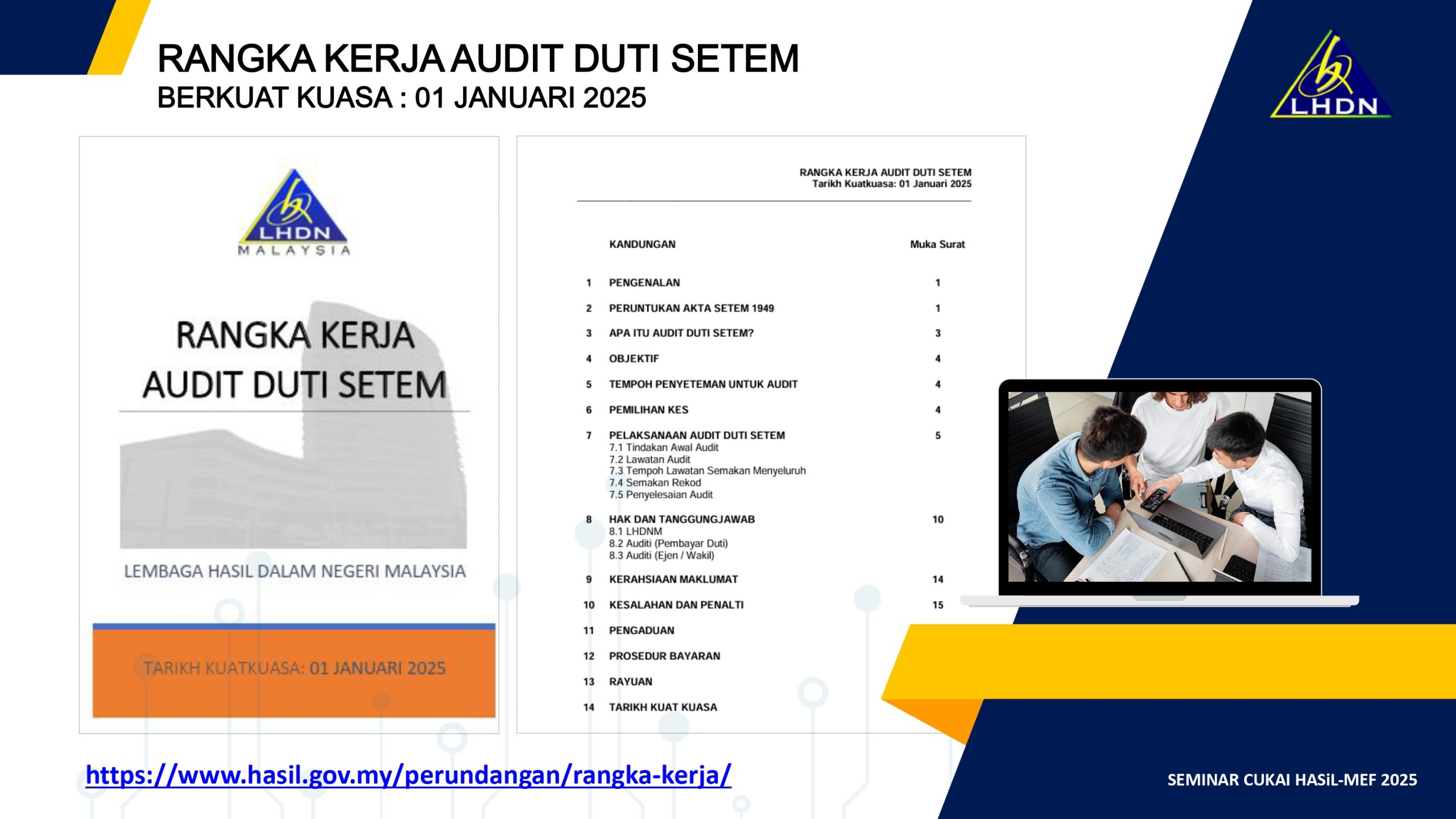 Melalui Belanjawan 2025, Kerajaan telah mengumumkan pelaksanaan Sistem Taksir Sendiri Duti Setem (STSDS) yang akan dilaksanakan secara berfasa mulai 1 Januari 2026. Selaras dengan keputusan ini, Lembaga Hasil Dalam Negeri Malaysia (HASiL) telah mengeluarkan Rangka Kerja Audit Duti Setem (RKADS) pada 1 Januari 2025 bagi menerangkan pelaksanaan audit duti setem secara menyeluruh. Susulan itu, aktiviti audit duti setem telah dimulakan di seluruh negara oleh HASiL.