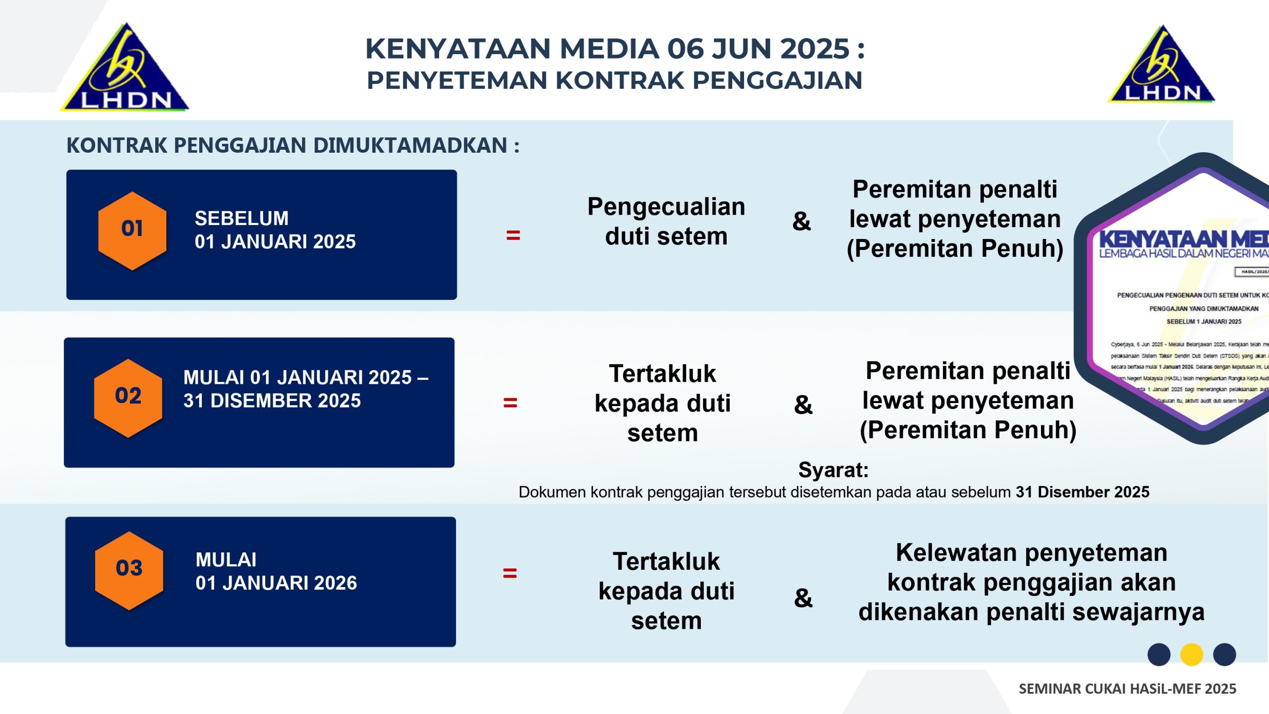 LHDN memaklumkan bagi mengurangkan beban majikan, Kementerian Kewangan telah membuat keputusan kontrak penggajian yang dimuktamadkan sebelum 1 Januari 2025 diberi pengecualian duti setem.