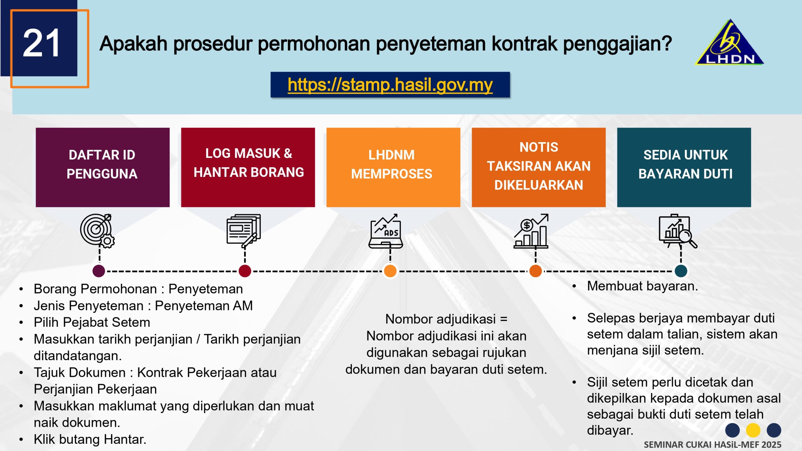 - Memberi penjelasan tentang dasar baharu duti setem untuk kontrak pekerjaan.