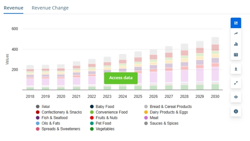 Sub-pasaran seperti produk tenusu & telur, daging, serta buah-buahan dan kacang menunjukkan pertumbuhan yang lebih perlahan, manakala makanan mudah (convenience food) dan makanan haiwan peliharaan berkembang dengan lebih pesat. Kadar pertumbuhan keseluruhan pasaran dipengaruhi oleh sub-pasaran ini dan kadar pertumbuhan mereka akan berbeza-beza.