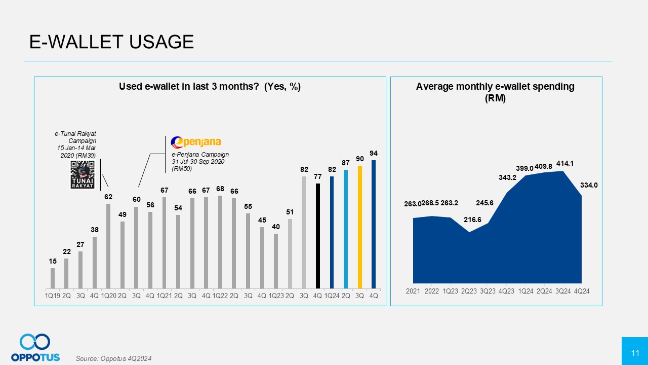 Kadar penggunaan e-wallet terus meningkat sebanyak 90% pada suku ketiga 2024. Peningkatan ini turut disokong oleh purata perbelanjaan bulanan e-wallet yang mencecah RM414.1.