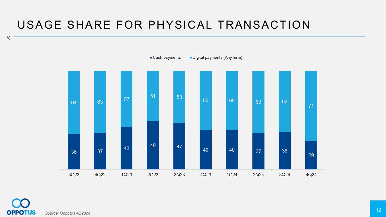 Apabila membandingkan pembayaran fizikal (tunai) dengan pembayaran digital, jelas bahawa penggunaan tunai semakin menurun sepanjang tahun lalu, manakala pembayaran digital terus mendapat momentum.