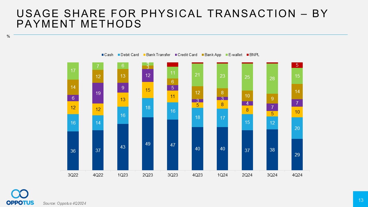 Pada suku kedua dan ketiga 2024, lebih daripada 62% pengguna memilih pembayaran digital. Pecahan menunjukkan e-wallet mendominasi dengan (28%) penggunaan, kad debit (12%), aplikasi perbankan (9%), kad kredit (7%) dan pindahan bank (5%).