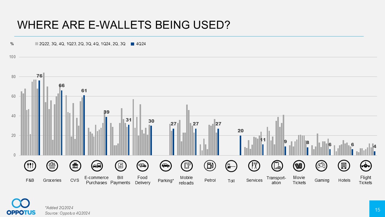 Penggunaan e-wallet di Malaysia paling dominan dalam tiga kategori utama, iaitu barangan runcit (71%), makanan dan minuman (F&B)(68%), dan kedai serbaneka (59%).