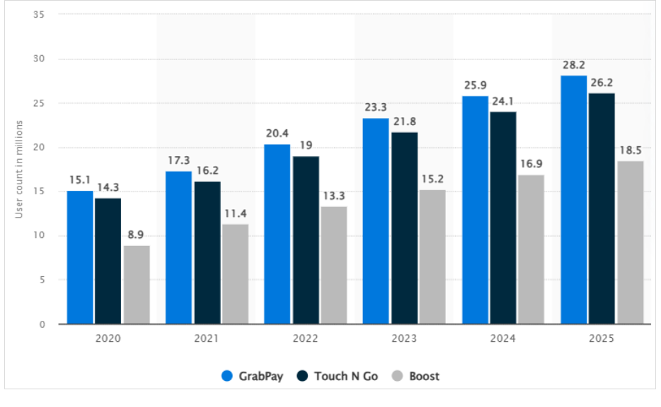 Platform seperti GrabPay, Touch ‘n Go, dan ShopeePay mendominasi pasaran, terutamanya dalam kalangan pengguna generasi muda.
