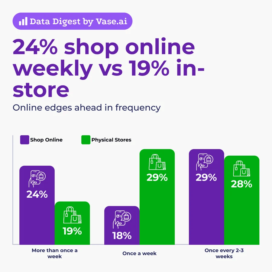 Corak yang hampir sama juga berlaku di kedai fizikal: 19% membeli lebih daripada sekali seminggu, 29% sekali seminggu, dan 28% setiap 2–3 minggu.