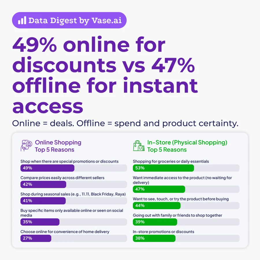 Perbezaan ini menunjukkan asas tingkah laku pengguna Malaysia: online didorong oleh harga, manakala offline didorong oleh kepercayaan.
