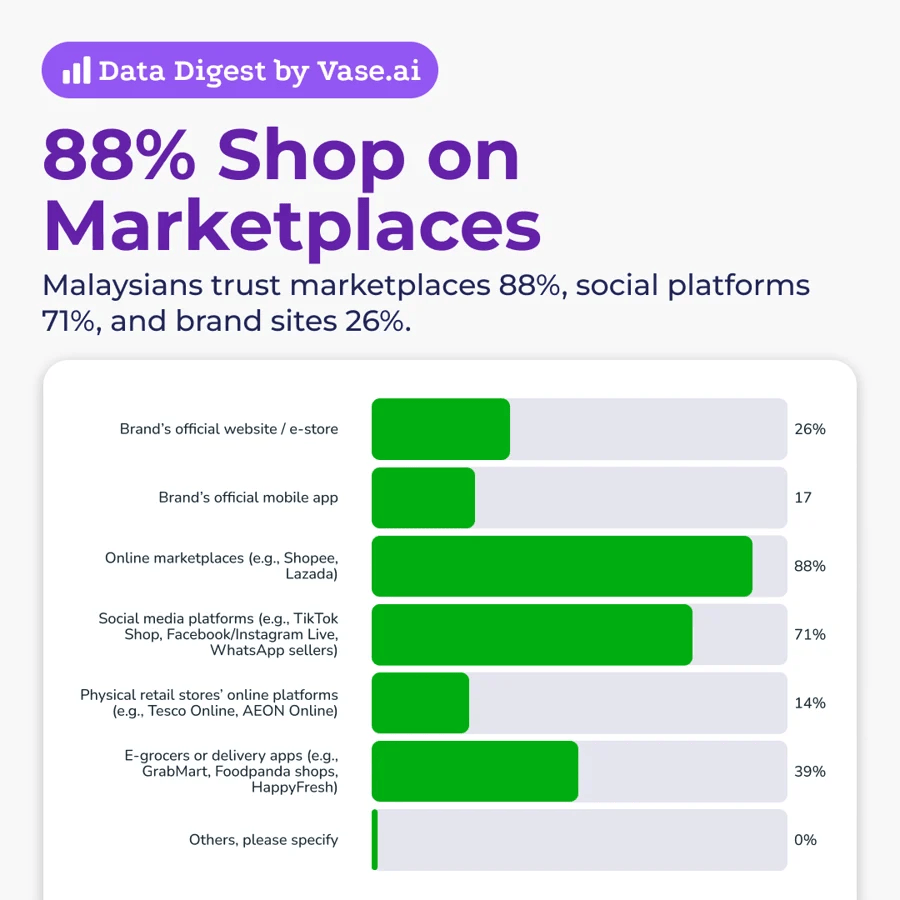 88% membeli melalui marketplace, 71% melalui platform sosial, dan 26% melalui laman web jenama.