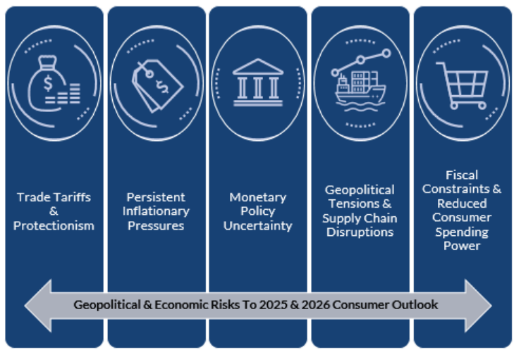 Pada 2025, sektor pengguna Malaysia berdepan tekanan daripada gabungan faktor global dan domestik. Antaranya ialah ketegangan perdagangan antarabangsa, gangguan rantaian bekalan akibat konflik geopolitik, serta harga barang yang kekal tinggi walaupun inflasi secara keseluruhan mula reda. Perubahan kadar faedah dan risiko kelembapan pasaran kerja turut menambah ketidaktentuan, sekali gus mempengaruhi keyakinan serta pola perbelanjaan pengguna — terutamanya bagi barangan bukan keperluan.