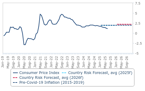 Sepanjang 2025, inflasi dijangka kekal sederhana pada purata 1.9%, sebelum naik sedikit kepada 2.2% pada 2026. Salah satu risiko utama kepada perbelanjaan pengguna adalah inflasi harga makanan. Walaupun kadar ini pernah mencecah purata 2.5% pada suku keempat 2024, ia kekal stabil pada 2.1% untuk dua bulan berturut-turut sehingga Jun 2025.