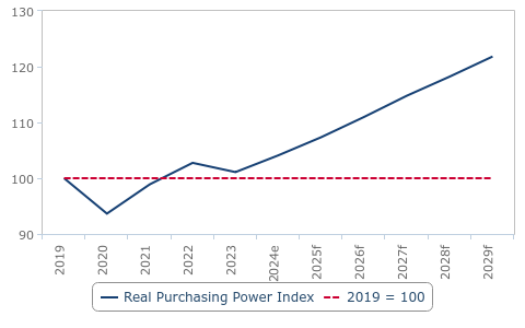 Pasaran pekerjaan yang kukuh dan kadar inflasi yang semakin stabil telah meningkatkan pendapatan sebenar rakyat Malaysia, sekali gus menambah jumlah pendapatan boleh guna (disposable income) isi rumah. Dianggarkan sehingga 2029 (2.1% yoy), pendapatan sebenar dijangka berkembang kepada purata 3.2% setahun, manakala kadar inflasi kekal sederhana sekitar 2.1%.