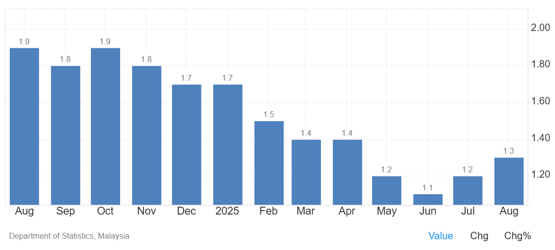 Menurut Jabatan Perangkaan Malaysia (DOSM), kadar inflasi tahunan Malaysia meningkat sedikit kepada 1.3% pada Ogos 2025 apabila Indeks Harga Pengguna (IHP) naik kepada 134.9 berbanding 133.2 pada bulan sama tahun sebelumnya.
