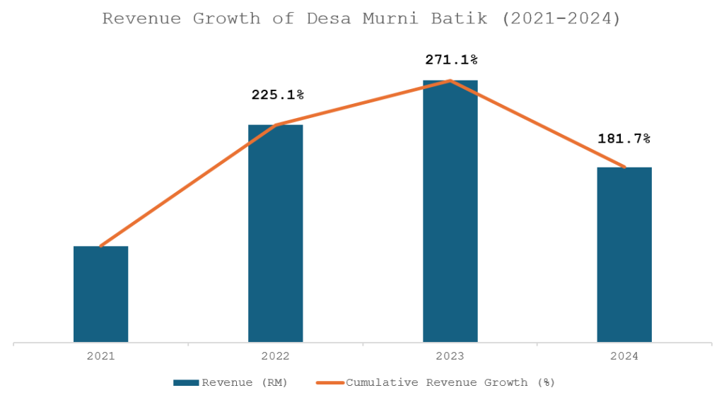 Desa Murni Batik experienced transformative growth between 2021 and 2023, reflecting the impact of Ahmad Akram Anwar’s leadership and strategic guidance from RCG (RichWorks Consulting Group). In its first year of restructuring, the business established a revenue baseline through offline channels while laying the foundation for digital expansion.