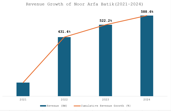 Noor Arfa Batik’s cumulative revenue growth of 431.4% in 2022, 522.2% in 2023, and 588.6% in 2024 marks a strategic turnaround driven by community empowerment and operational restructuring. Rather than relying solely on traditional retail models, the company adopted a community-based reseller strategy that mobilized local women and underserved groups into active brand partners. This approach not only expanded market reach organically but also positioned Noor Arfa as a purpose-led brand with deep roots in cultural heritage and economic empowerment.