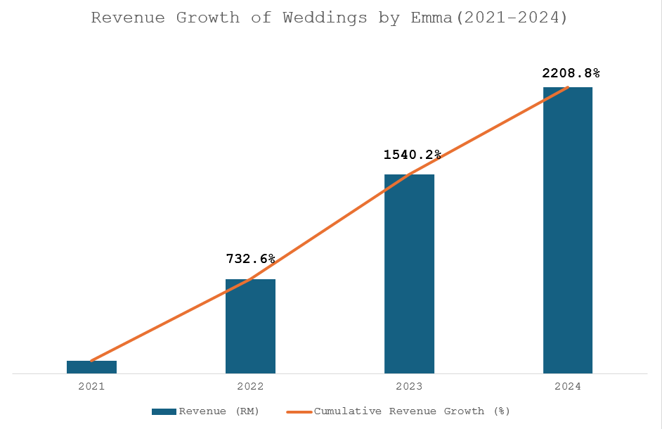 Weddings By Emma has demonstrated remarkable cumulative financial growth—expanding by 732.6% in 2022, 1,540.2% in 2023, and reaching 2,208.8% in 2024 compared to its 2021 baseline. This trajectory underscores the brand’s ability to rapidly scale while maintaining operational discipline. The consistent upward growth reflects the company’s success in systemizing internal operations, implementing structured business frameworks, and scaling service delivery through targeted client engagement and operational efficiency.